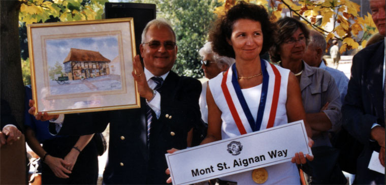 Additionally in term time the town is home to 20,000 students. The Mont-Saint-Aignan International Twinning website is http://www.mont-saint-aignan-international.org Mont-Saint-Aignan town website is http://www.ville-mont-saint-aignan.fr/ It describes Mont-Saint-Aignan as : Holy Mont Aignan ; Town of action, town of the future Chief town of canton, in the department of Seine-Maritime, the commune of Mont-Saint-Aignan is located at the north of Rouen. Resolutely turned towards the future, the city preserves with pride its history, its roots and its identity thanks to the various districts which make it up. A university town, its population is a little more than 21.000 inhabitants, plus nearly 20.000 students. Between city and forest, Mont -Saint-Aignan is a residential town which enjoys 25% of green spaces, with many parks and public gardens. Town of all generations, it offers its inhabitants a wide range of activities cultural and sporting; it has significant facilities for leisure and relaxation, maintained with the support of many associations. Mont-Saint-Aignan is a city of manageable proportions which has succeeded in reconciling economic development and quality of life. Important in the area, it forged a strong economic personality of 900 companies. It’s good to live in Mont-Saint-Aignan! Mayor Françoise Guégot accepts gifts from Edenbridge Town Council at the 30th Anniversary of our twinning.
